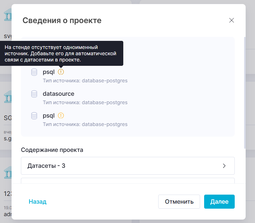 Если вы видите такие уведомления в окне сведений о проекте, убедитесь, что на стенде существуют необходимые источники данных для датасетов.
