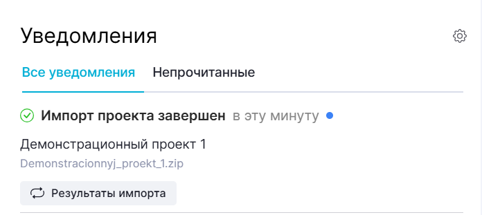 7. В уведомления системы поступит уведомление о импорте либо ошибке импорта проекта. Уведомление о импорте содержит кнопку "Результаты импорта", при нажатии на которую открывается окно сведений о замененных либо добавленных сущностях.