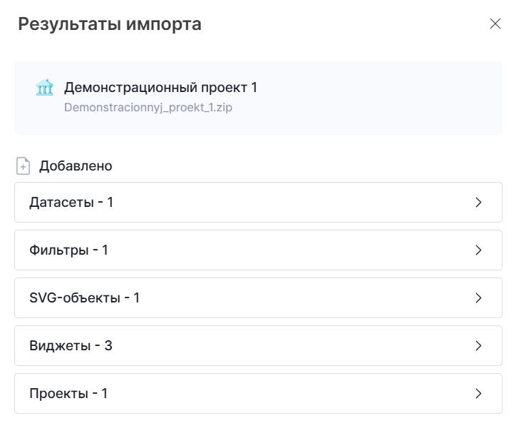 * Данные датасетов не сохраняются экспортом. После импорта проекта, для затронутых импортом (созданных или измененных) датасетов необходимо выполнять восстановление данных.