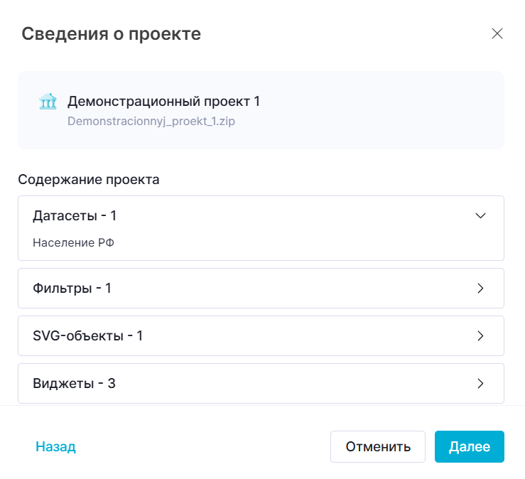 6. После загрузки система выводит модальное окно с информацией о проекте и содержимом файла экспорта.