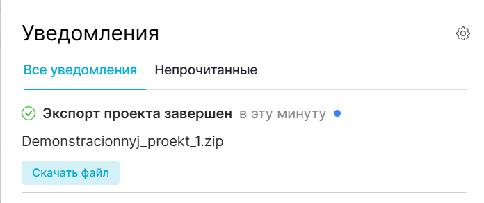4. Когда файл экспорта сформирован, поступает соответствующее уведомление. Откройте окно уведомлений, найдите уведомление «Экспорт проекта завершен» и нажмите в нем кнопку «Скачать файл».