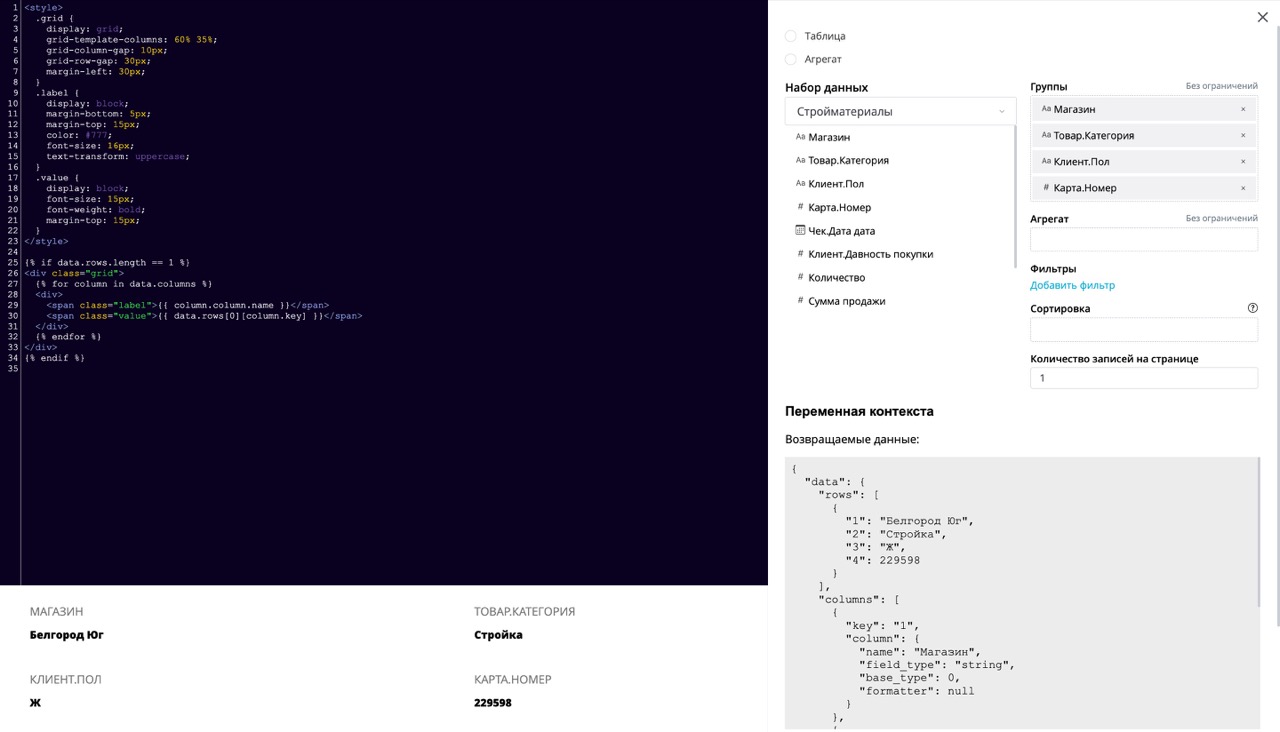 В правой части страницы находится область настройки данных. Область служит для получения данных из датасета. Полученные данные используются в редакторе кода. Получать данные можно в агрегированном виде или таблицей.
