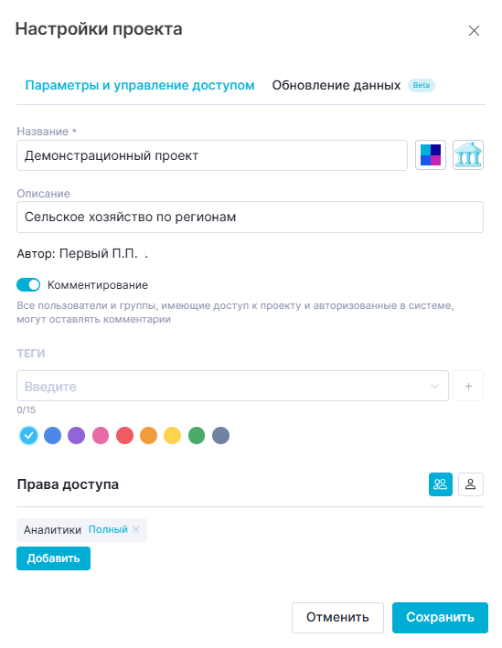 Для включения функциональности комментирования необходимо в окне настроек проекта (при создании, в реестре проектов или по кнопке в режиме редактирования) оставить включенным либо включить ползунок "Комментирование".