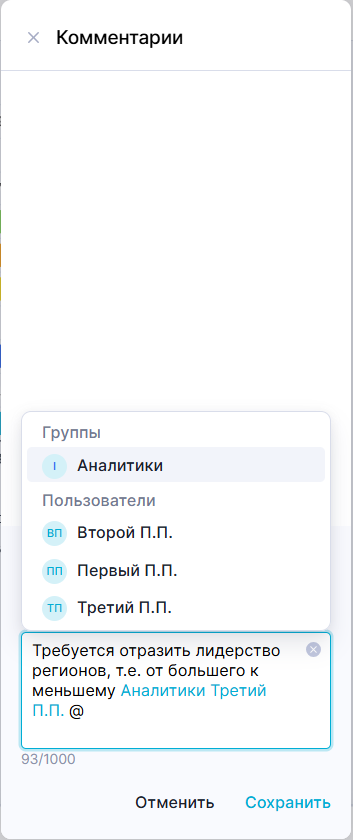 При вводе текста комментария допустимо упоминание пользователей и целых групп. Для этого необходимо в поле ввода текста ввести символ @, после чего отобразится всплывающий список пользователей и групп, которым явно предоставлен доступ к проекту в настройках проекта, а также администраторов и суперпользователей. Для упоминания пользователя или группы достаточно выбрать их в списке.