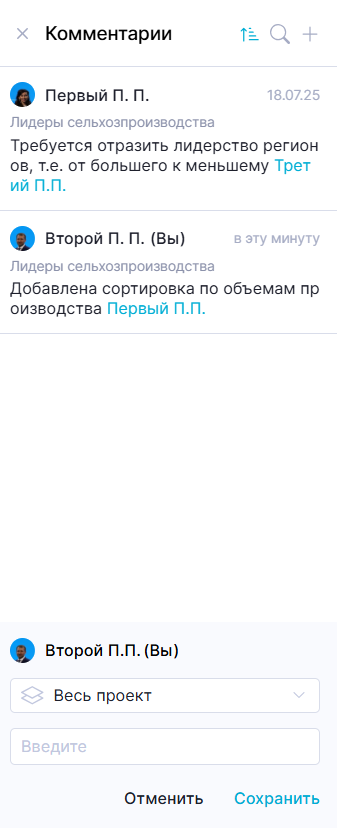 Функциональность добавления комментариев к проекту доступна и в режиме просмотра, и в режиме редактирования, если она включена в настройках проекта.