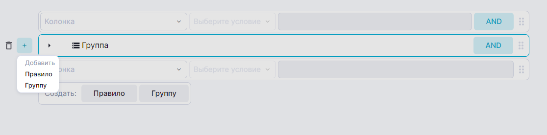 Когда в фильтре есть правило или группа, последующие правила и группы можно создавать: