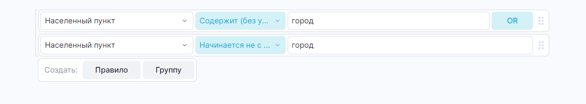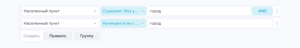Кнопка логического оператора автоматически отображается у всех правил и групп в списке, кроме последнего элемента списка. По умолчанию используется логический оператор «AND». Нажимайте кнопку оператора, чтобы переключаться между операторами «AND» и «OR».