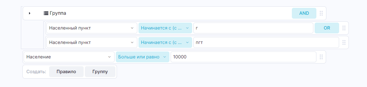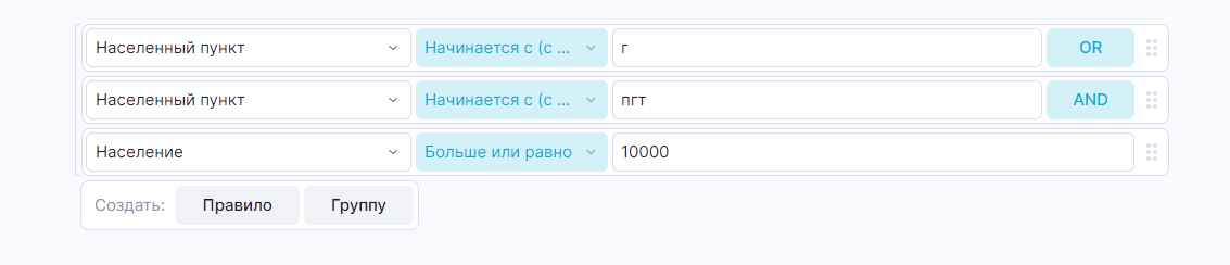 Расширенный фильтр представляет собой список правил. Правило фильтра состоит из колонки датасета, условия проверки и проверяемого значения. Когда правил в списке больше одного, они связываются логическими операторами «AND» и «OR». Количество правил в фильтре не ограничено. Запись датасета удовлетворяет фильтру, когда она удовлетворяет какому-либо правилу или связке правил.