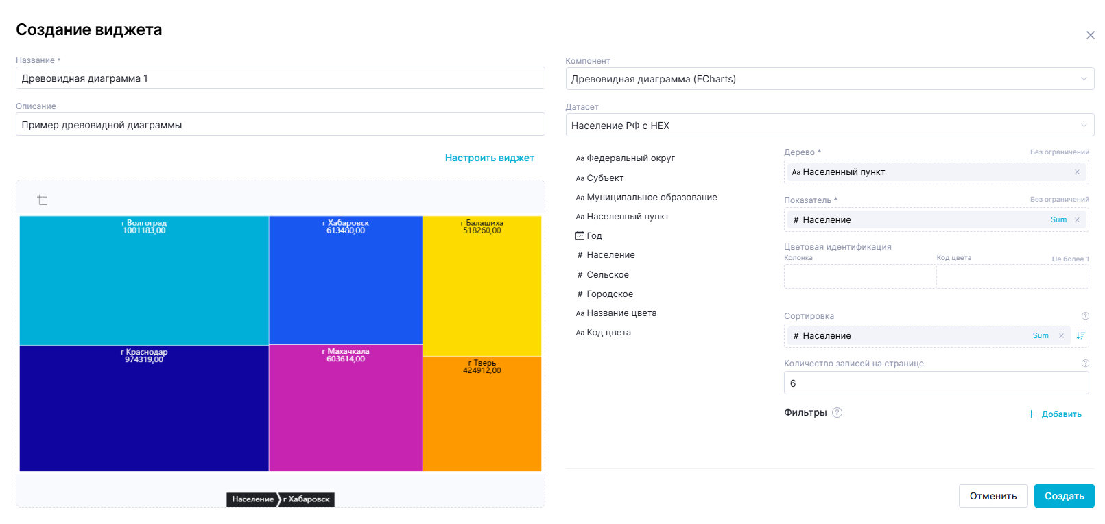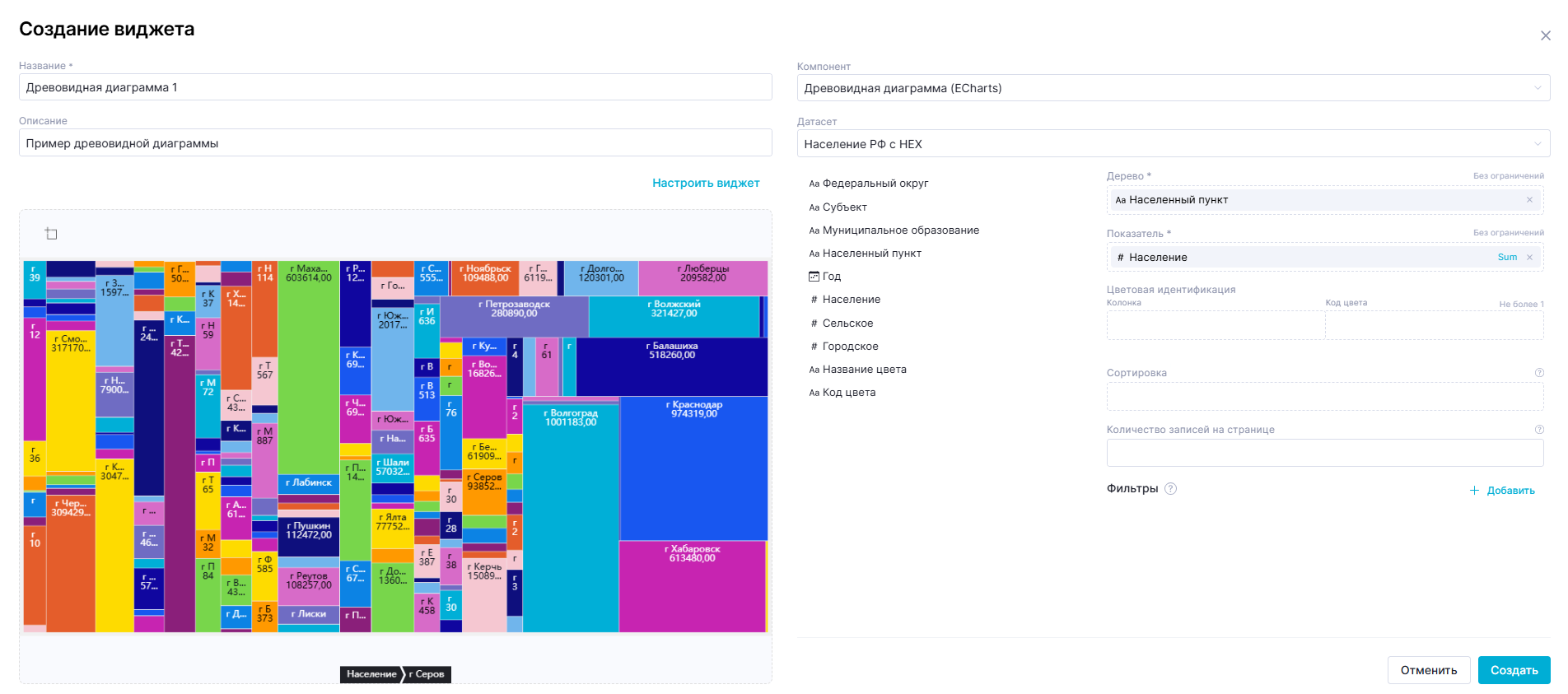 В поле «Дерево» вынесены колонки «Федеральный округ» и «Населенный пункт». Колонка «Населенный пункт» выполняет роль слоя детализации