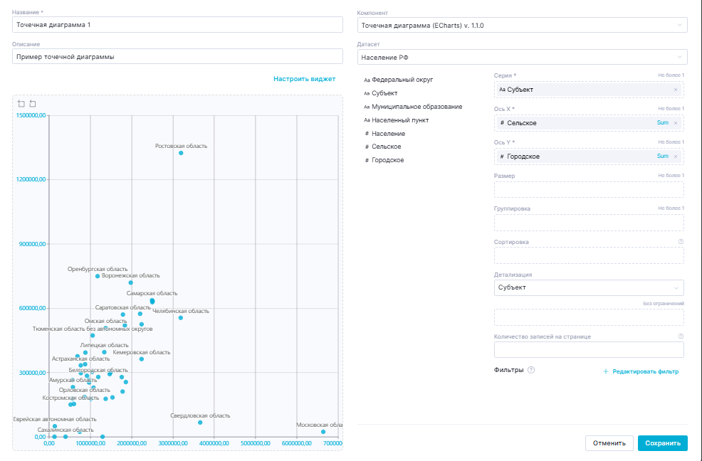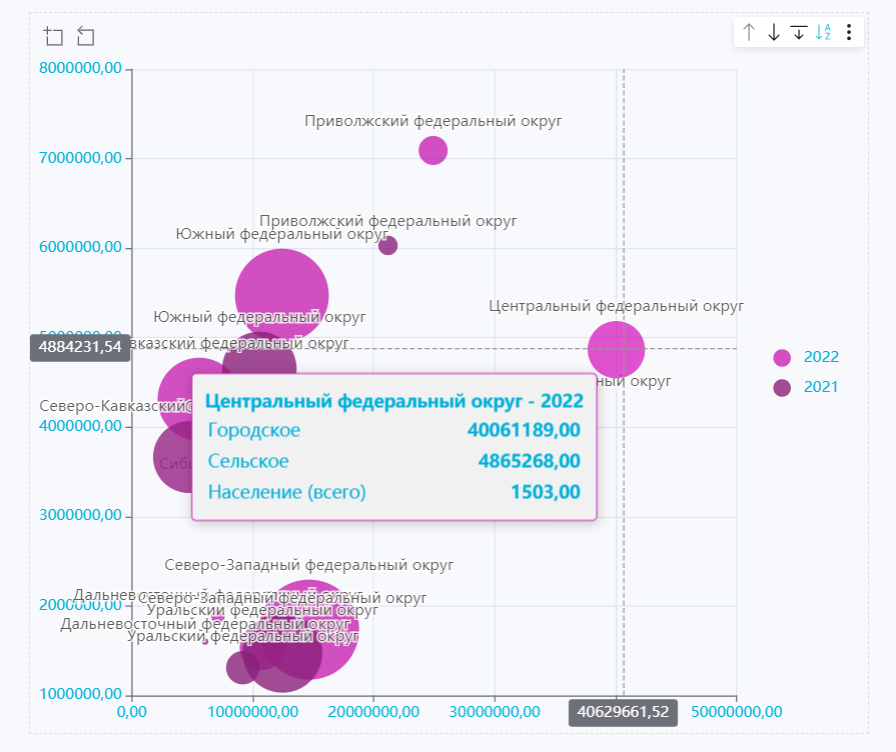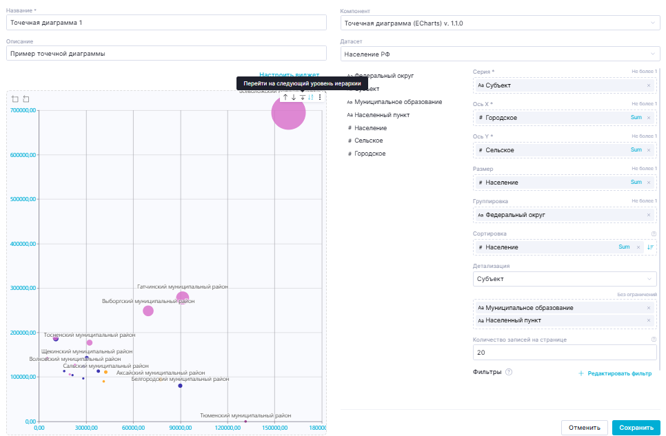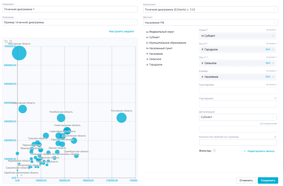 • Всплывающие подсказки – отображение подсказки по наведению на точку группы. В подсказке отображаются значения полей «Серия», «Ось X», «Ось Y», а также «Группировка» и «Размер».