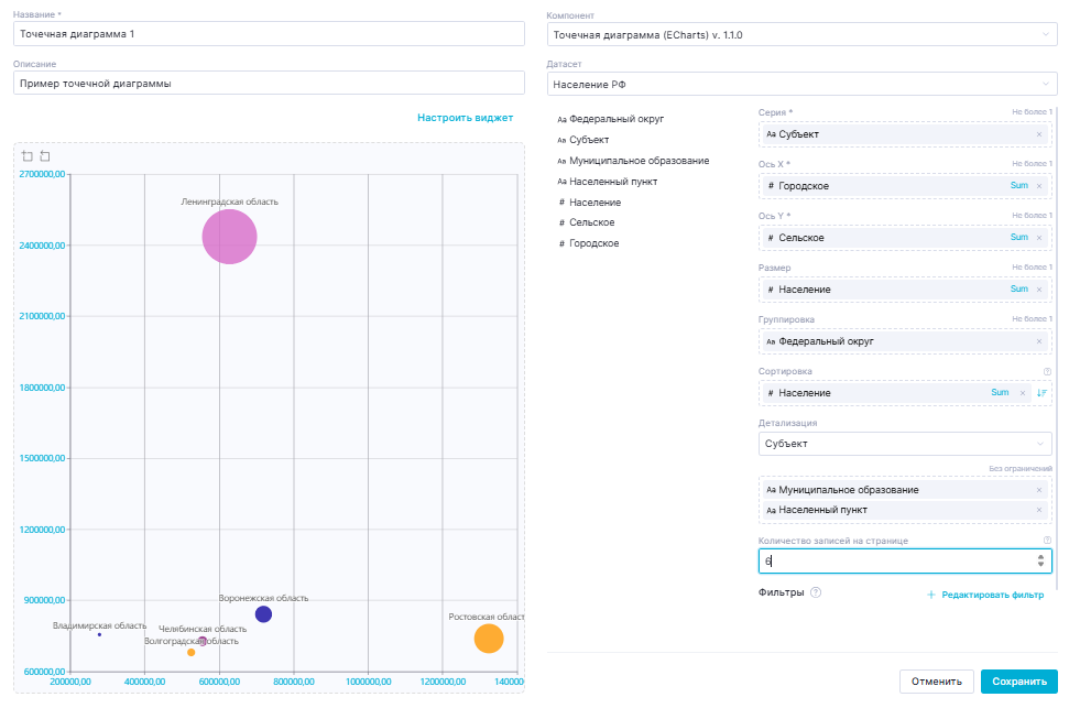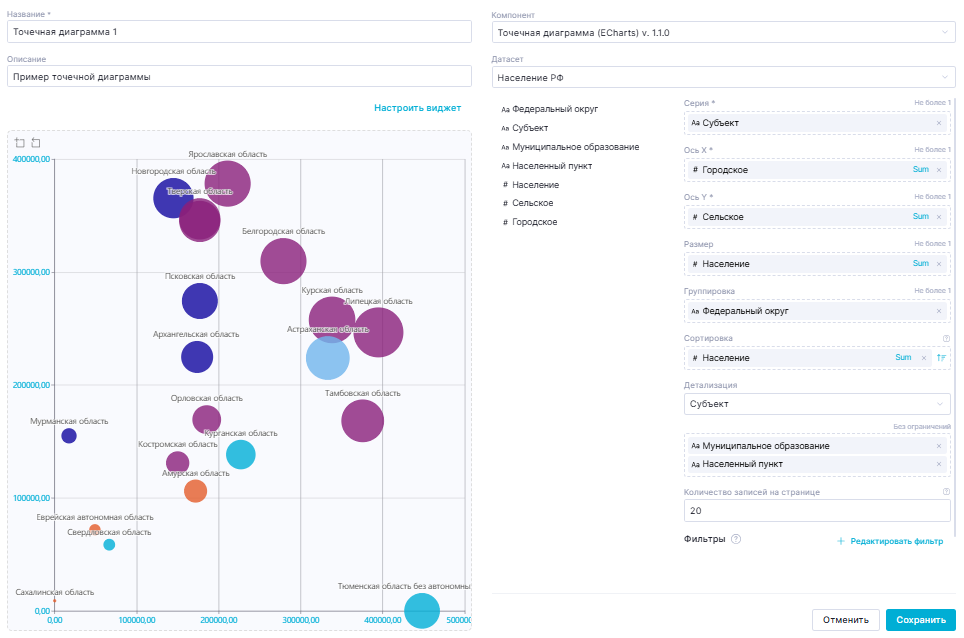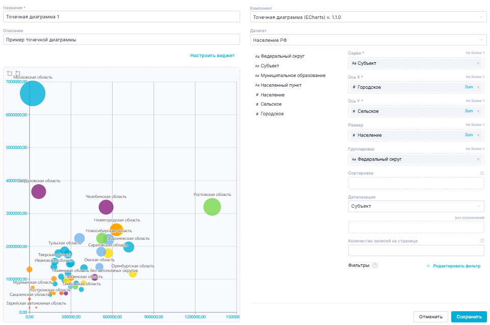 Для корректного отображения виджета поля «Ось X», «Ось Y» и «Размер» должны иметь одинаковый тип данных.