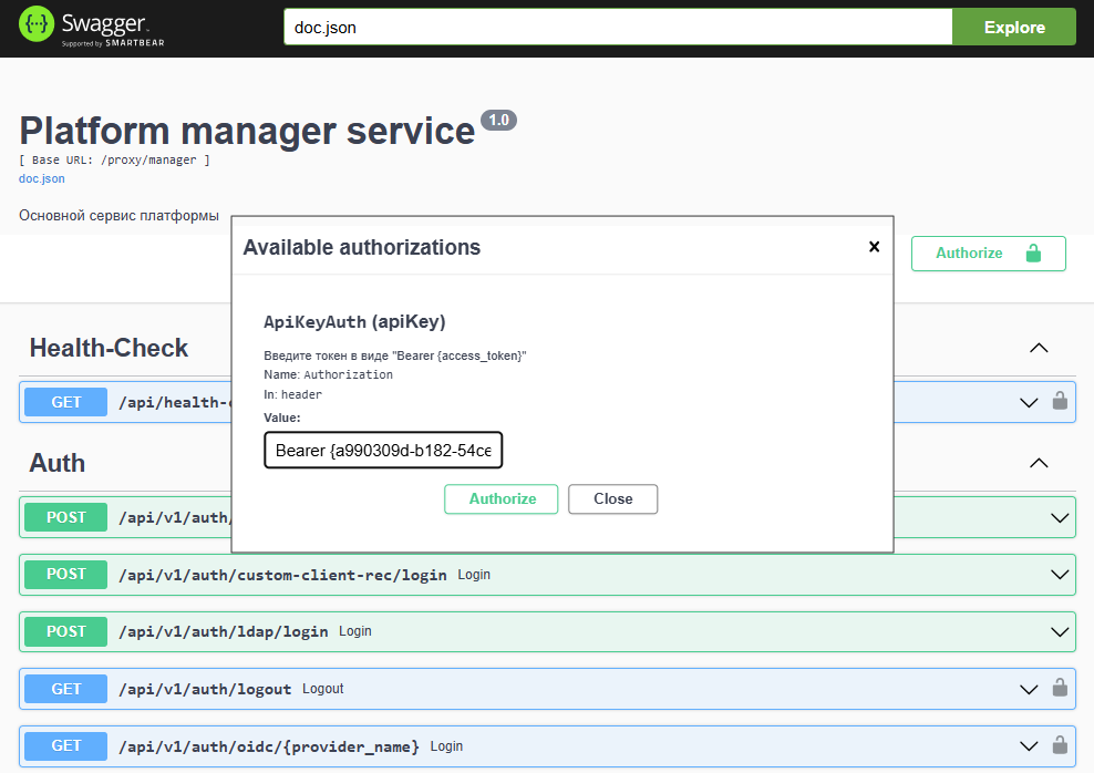 Чтобы авторизоваться в Swagger, нажмите на кнопку Authorize и введите API-токен, который можно сгенерировать в профиле пользователя в формате Bearer {токен}. Нажмите Authorize в модальном окне. После успешной авторизации вы сможете выполнять методы API модуля, используя Swagger.