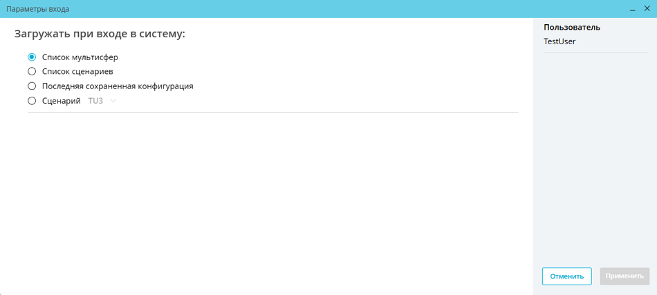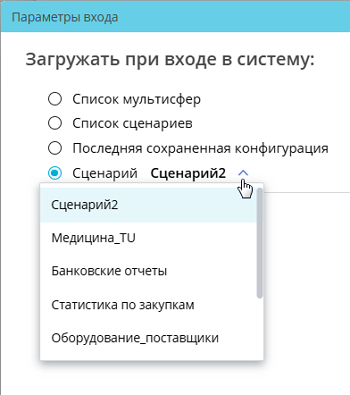 - Последняя сохраненная конфигурация — открываются слои и окна модулей на них (это могут быть модули «Мультисфера», «Карта», «Ассоциативные правила», «Графика») в состоянии, в котором они находились на момент завершения сессии работы в приложении. Завершением сессии считается клик кнопки «Выход» или завершение времени жизни сессии.