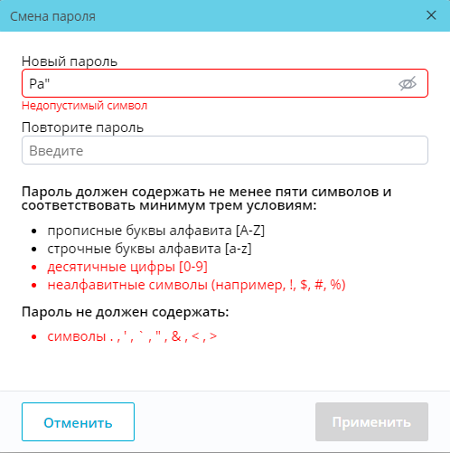 Пароль не должен содержать символы ., ', `, ", &, <, >. Соответствующая подсказка также отображается в окне смены пароля. Если пользователь вводит запрещенный символ, текст подсказки и контур поля «Новый пароль» окрашиваются в красный цвет, а под полем выводится предупреждение «Недопустимый символ», выделенное красным цветом: