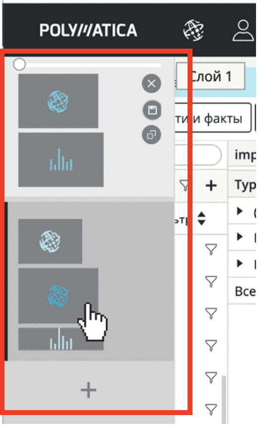 Слой – область для работы, которая не имеет ограничения по высоте. Вся аналитическая работа выполняется на слое. При достижении видимой части экрана слой будет продолжен, новые окна будут открываться ниже. Все окна, открытые на слое, можно перемещать, удерживая заголовок окна, а также менять их размер.