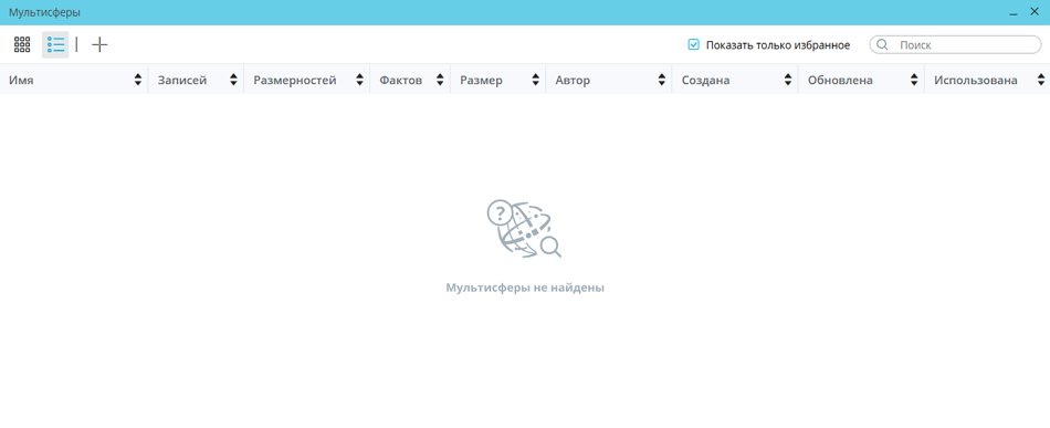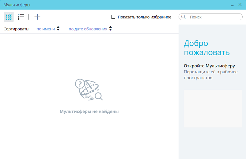 Как в плиточном, так и в табличном представлении списка мультисфер, при отсутствии мультисфер, доступных пользователю, или результатов, удовлетворяющих запросу в поле поиска, а также если чекбокс «Показать только избранное» отмечен, а избранных мультисфер у пользователя нет, в окне «Мультисферы» отображается сообщение «Мультисферы не найдены»: