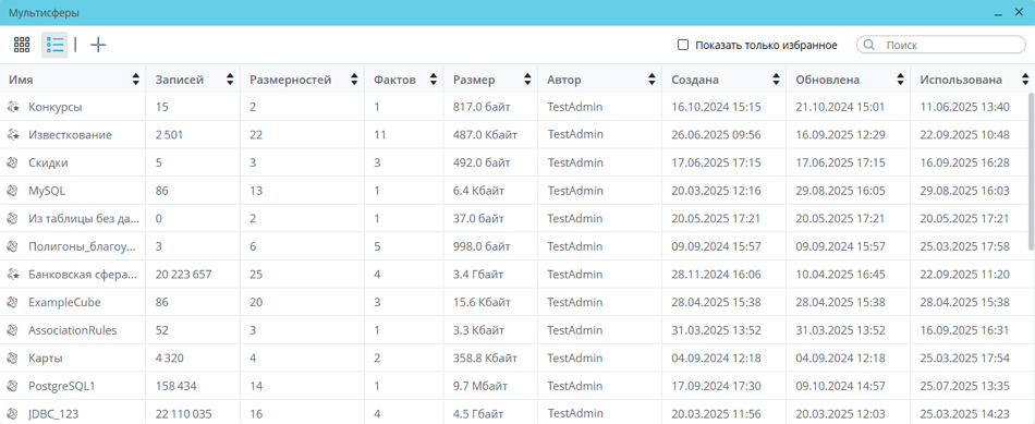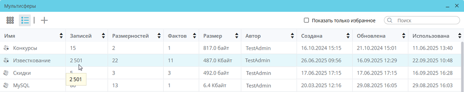 Представление списка мультисфер в виде таблицы позволяет сортировать мультисферы не только по имени и дате обновления, но и по дате создания и последнего использования мультисферы, ее размеру, количеству содержащихся в ней записей, размерностей и фактов, а также по автору. Для сортировки используются кнопки  , расположенные в каждом столбце шапки таблицы. При нажатии кнопка окрашивается в голубой цвет. Для отмены примененной сортировки нужно повторно нажать на кнопку.