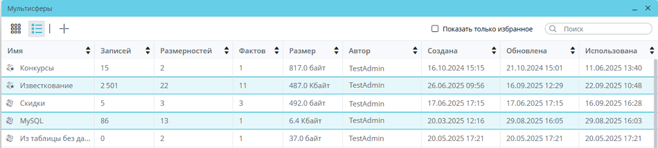 Окно «Мультисферы» содержит доступные для работы мультисферы, а также информацию по ним: