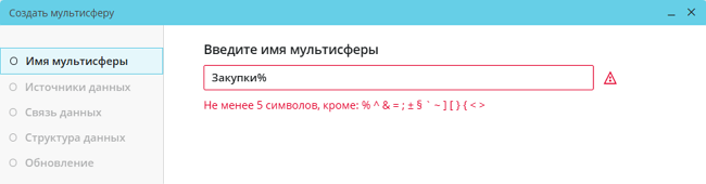 Существуют ограничения при вводе имени мультисферы (см. примечание на форме ввода имени мультисферы). Максимальное количество символов в имени мультисферы — 99. В случае ввода недопустимых символов или неподходящего количества символов форма ввода будет выделена красным цветом и отобразится соответствующий значок: