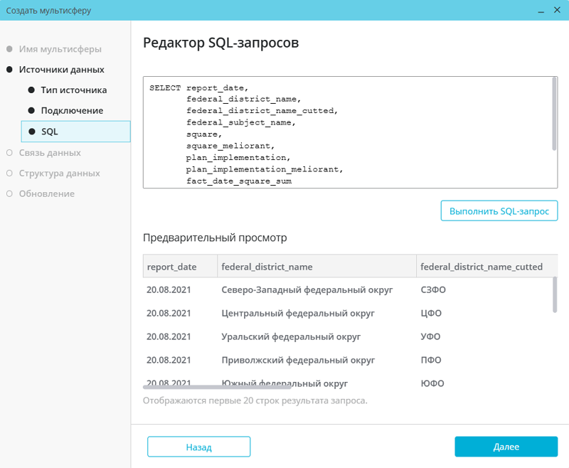 О редактировании SQL-запроса см. в разделе «Изменение структуры мультисферы для SQL-источников».