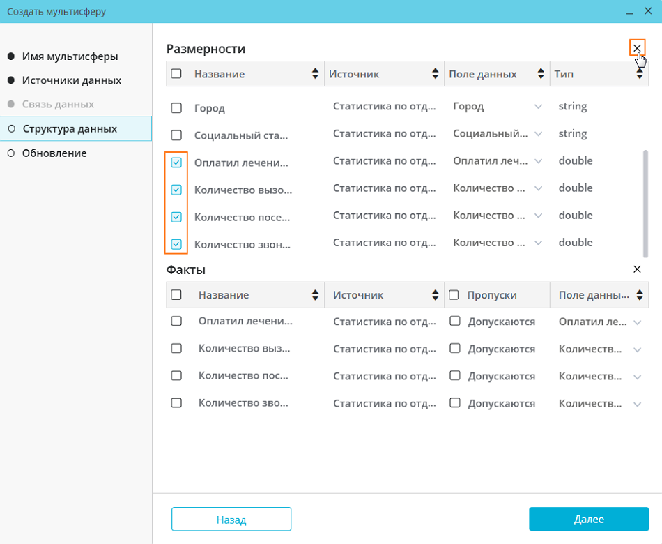 Чтобы удалить размерность или факт, необходимо отметить их галочкой и нажать на кнопку «Удалить»: