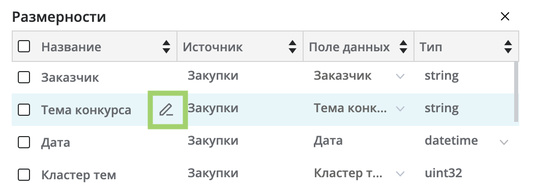 Чтобы переименовать размерность или факт, нажмите на значок карандаша, который появится при наведении мыши на соответствующую строку в таблице: