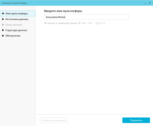 Имя мультисферы, источники данных, связи данных, структуру данных и настройки обновления мультисферы можно изменить на соответствующих вкладках окна. Для применения изменений, внесенных на любой из вкладок, нужно нажать на кнопку «Сохранить», а для отмены — на кнопку «Отменить изменения». Пока внесенные изменения не отменены или не сохранены, пользователь не может переходить на другие вкладки: