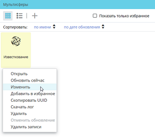 Обновление после редактирования структуры данных, связей данных или источников данных требуется не только для дальнейшей работы с мультисферой, но и в случае необходимости повторного редактирования структуры данных, связей данных или источников данных.