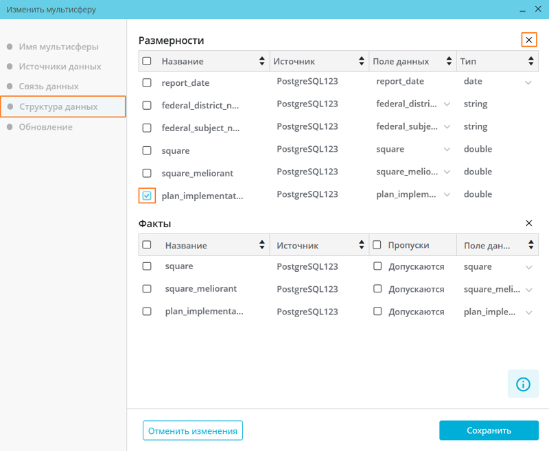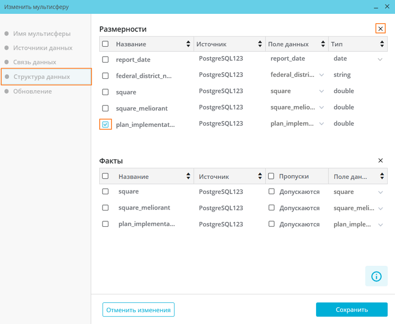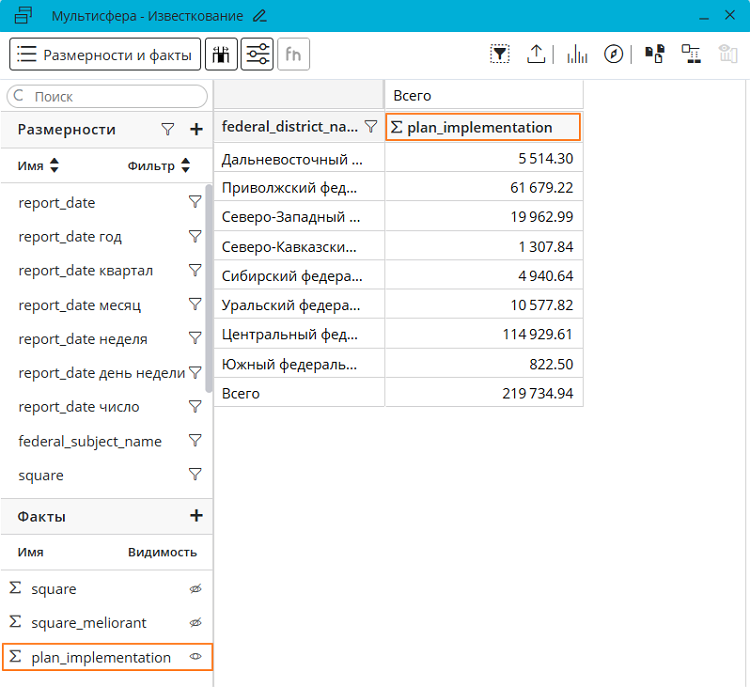 Предположим, в таблице «public.Известкование» добавилось поле (например, числовой показатель plan_implementation) и пользователю необходимо добавить его в мультисферу (в качестве факта). Для этого необходимо выполнить следующие шаги: