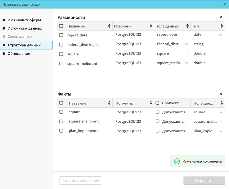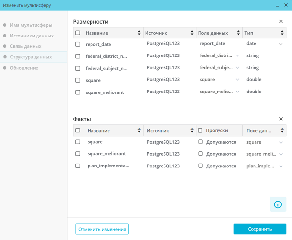Структура мультисферы (набор размерностей и фактов) обновится только после обновления мультисферы (вручную или по расписанию).