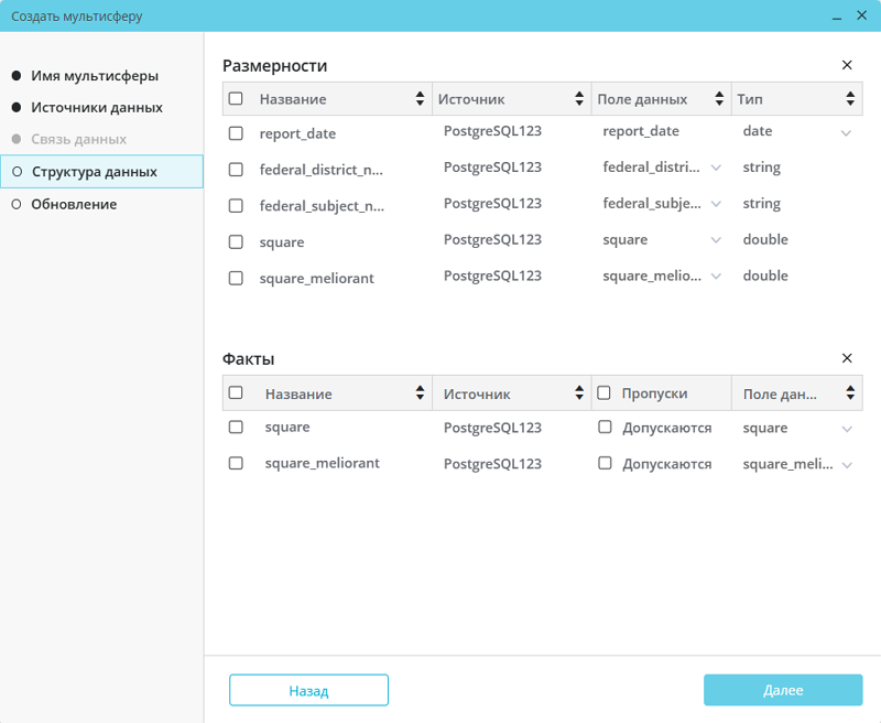 В случае если в SQL-запросе отсутствует явное перечисление полей, то есть используется SQL-запрос формата SELECT * FROM, для удаления размерности/факта из мультисферы достаточно перейти на вкладку «Структура данных» и удалить «неактуальные» поля. После чего нужно обновить мультисферу.