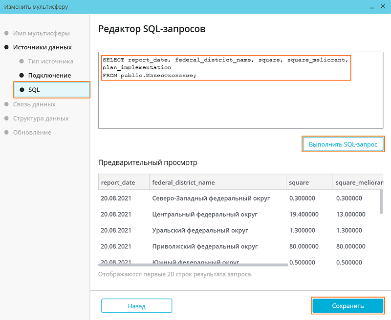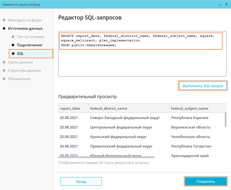 Вкладка «Источники данных»Перейти на вкладку «SQL», ввести измененный SQL-запрос (без поля federal_subject_name), после чего нажать на кнопку «Выполнить SQL-запрос» и затем на кнопку «Сохранить».