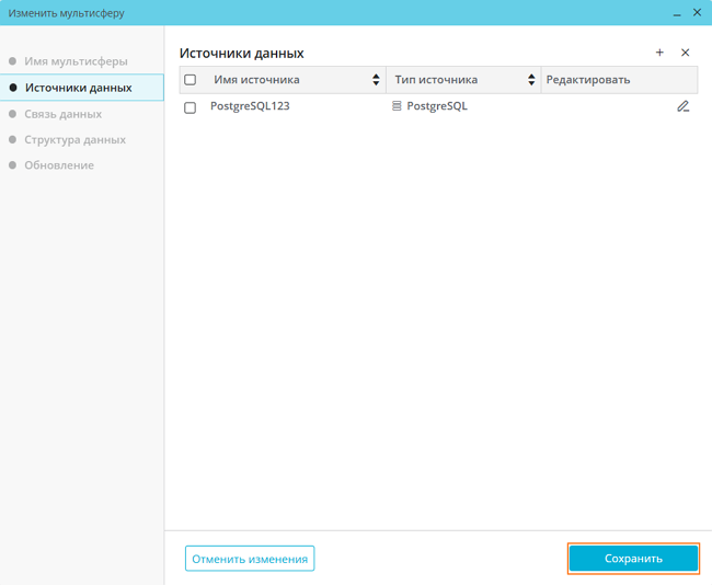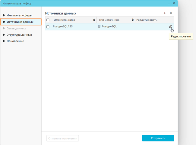 Переход в режим редактирования мультисферыПерейти на вкладку «Источники данных» и нажать на иконку «Редактировать» справа от источника.