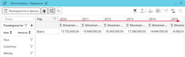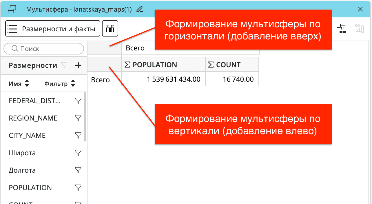 - Добавление размерности вверх формирует мультисферу по горизонтали. При размещении размерностей слева и сверху, удобно просматривать и анализировать с помощью модулей данные в динамике (расположив сверху, например, месяцы, кварталы, годы). При размещении размерности сверху, элементы размерности отображаются слева направо в верхней части мультисферы: