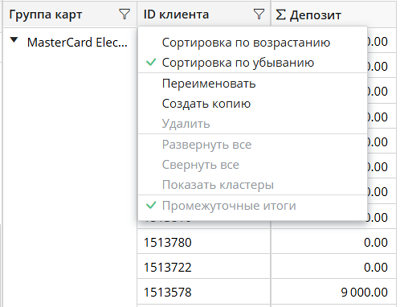 Для того, чтобы воспользоваться пользовательской сортировкой, необходимо открыть контекстное меню размерности, вынесенной в рабочую область. В зависимости от типа вынесенной размерности выводится соответствующее контекстное меню.