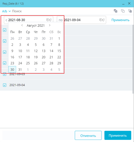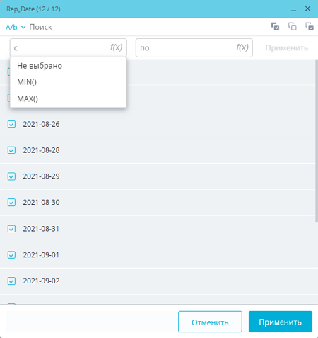 Для настройки такой подстановки используется кнопка в правой части полей «с» и «по». По нажатию на кнопку появляется выпадающее меню с опциями «Не выбрано», «MIN()» и «MAX()»:
