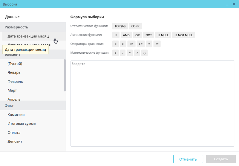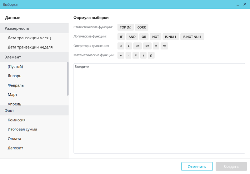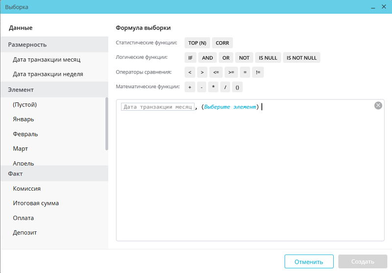 Выбор размерностей, элементов и фактовЗадайте условие. Для задания условия выборки можно использовать следующие функции и операторы: