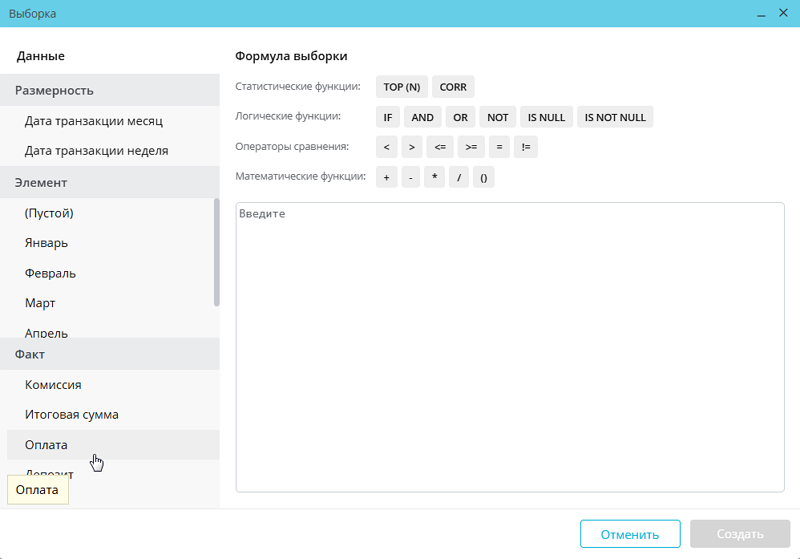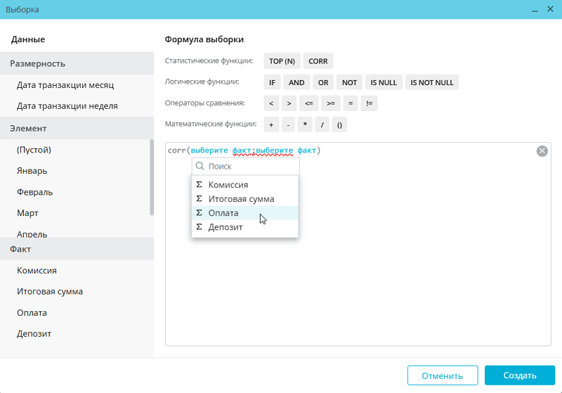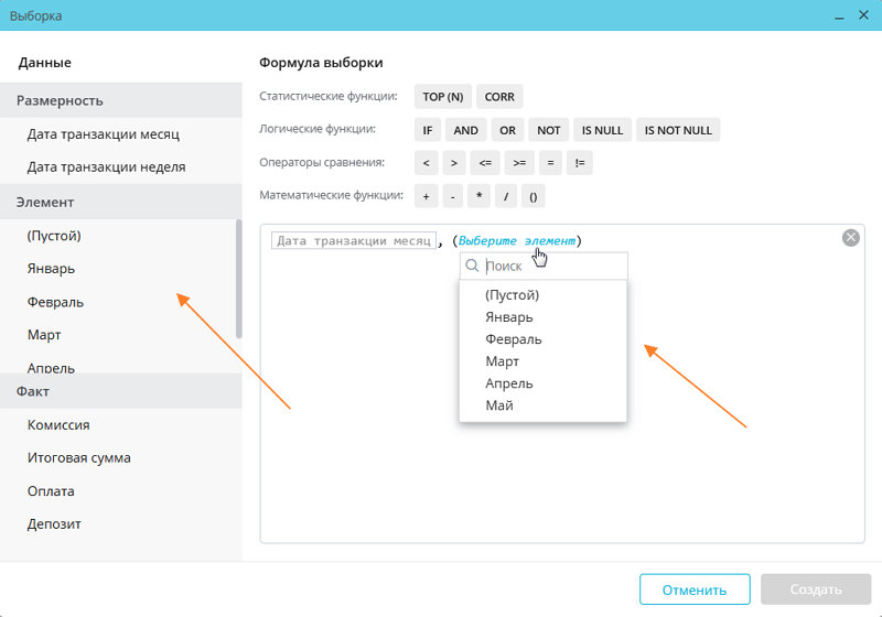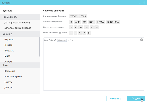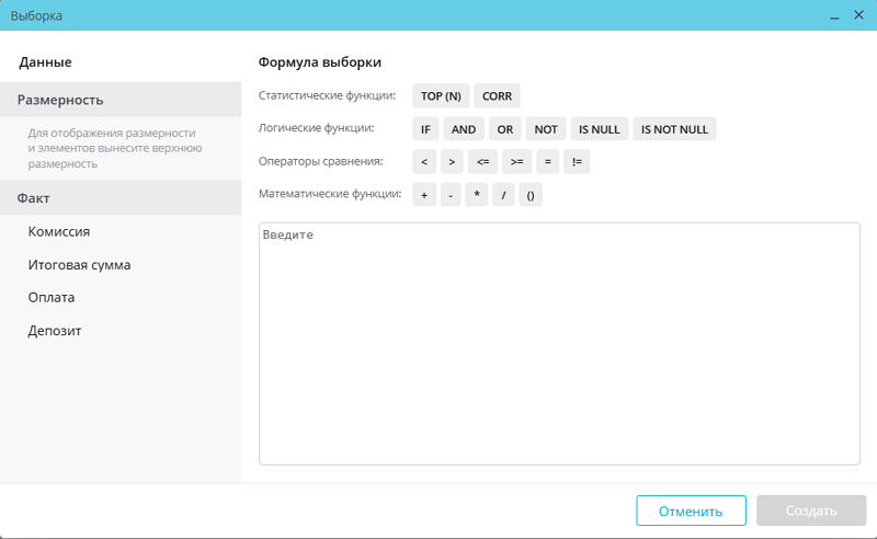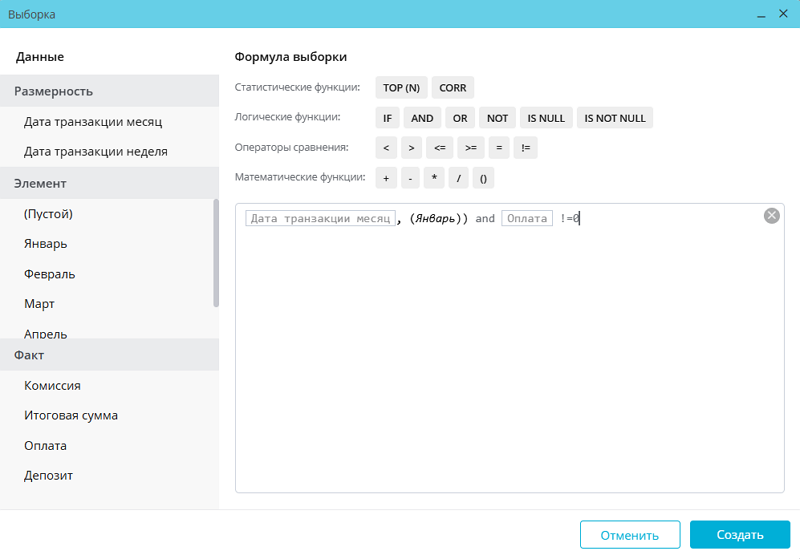 Условия для выборки задаются в формуле посредством выбора объектов в блоке «Данные» (или в выпадающих списках в поле ввода формулы) и с помощью кнопок для применения функций и операторов, а также с помощью ввода значений с клавиатуры. В формуле обязательно нужно указать условия по крайней мере для одного факта.