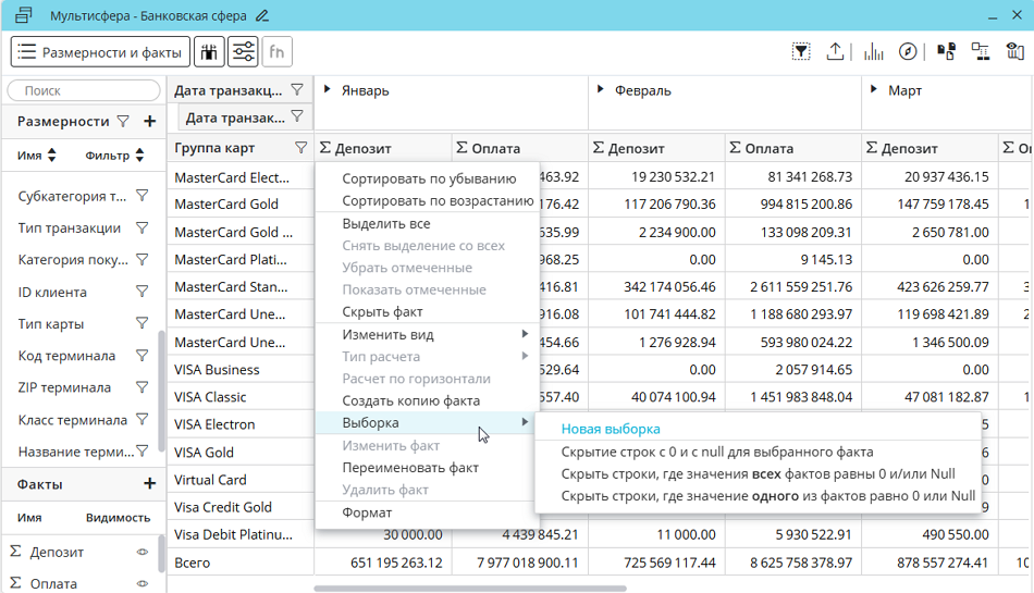 В Polymatica Analytics есть три предустановленных шаблона выборки и возможность создания пользовательской выборки. Функциональность выборки доступна через контекстное меню факта: