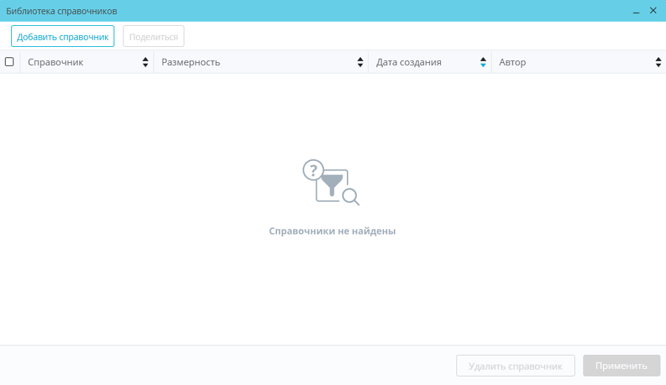 Если ни один справочник не добавлен, в окне «Библиотека справочников» отображается сообщение «Справочники не найдены»: