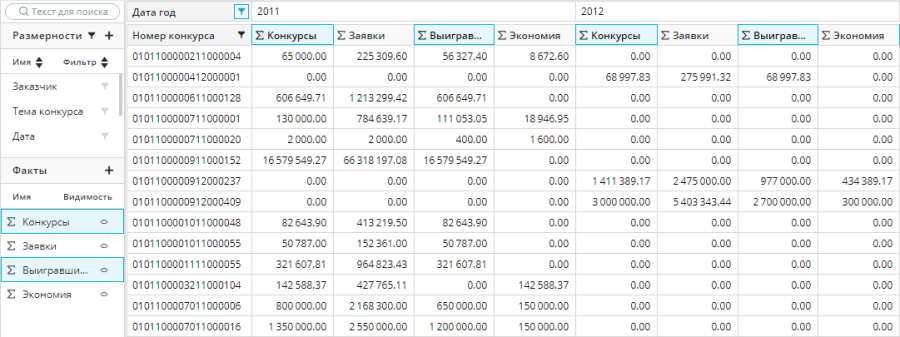 Для работы с различными модулями также поддерживается выделение фактов. Факты можно выделить как непосредственно в области данных мультисферы, так и на панели Размерности и факты. Блок выделенного факта имеет голубой цвет: