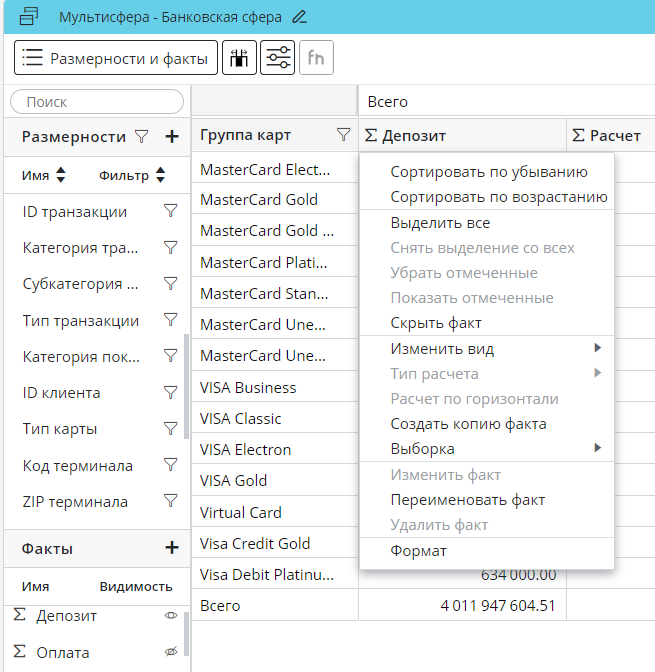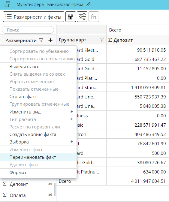 Контекстное меню факта доступно как в панели Размерности и факты, так и в области данных: