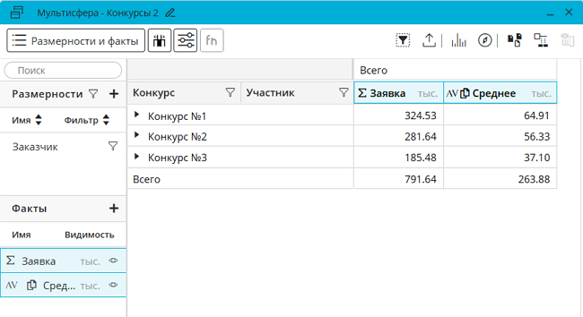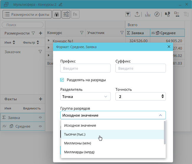 - Группа разрядов – позволяет выбрать разрядность отображения факта (тысячи, миллионы, миллиарды). Если группа разрядов выбрана, она отображается рядом с названием факта в мультисфере (например, «Заявка тыс.»), как в области данных, так и в блоке фактов на панели размерностей и фактов. Значение факта при этом автоматически пересчитывается, чтобы удовлетворять выбранной разрядности (так, 5 000 000 будет отображаться как «5» при выборе группы разрядов «Миллионы»).