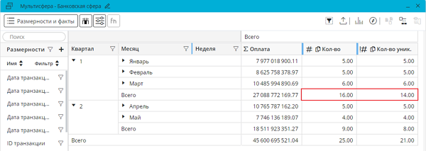 На рисунке ниже факт Кол-во имеет вид Количество, а факт Кол-во уник. — вид Количество уникальных. Если настроить расчет этих фактов по опорной размерности Неделя и раскрыть элементы размерности Квартал, то можно увидеть, что значения фактов Кол-во и Кол-во уник. в строке Всего для первого квартала различаются. Разница в две единицы как раз и отражает две повторяющиеся недели на стыке месяцев. Для второго квартала и для итогов по двум кварталам ситуация аналогичная.