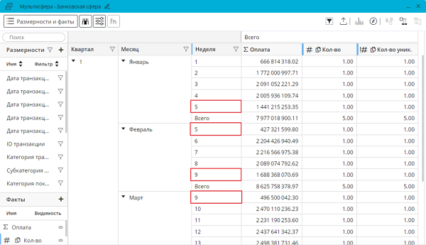 Для каждого месяца на рисунке выше значения фактов Кол-во и Кол-во уник. одинаковые, потому что в рамках каждого месяца номера недель не дублируются.