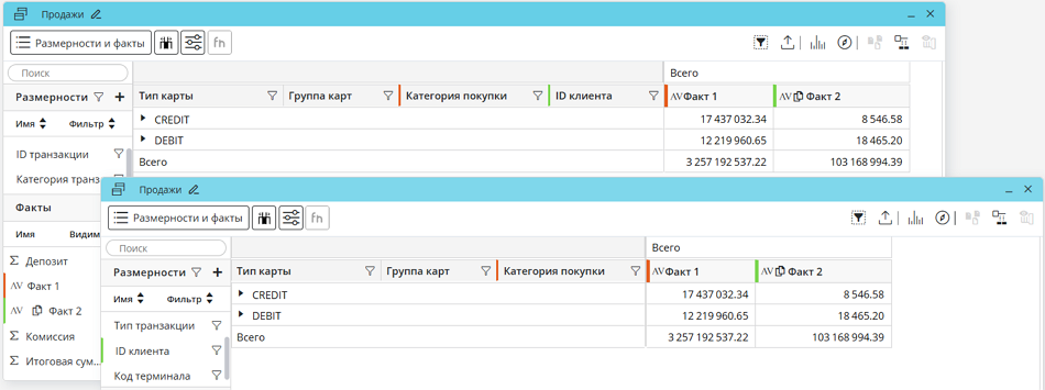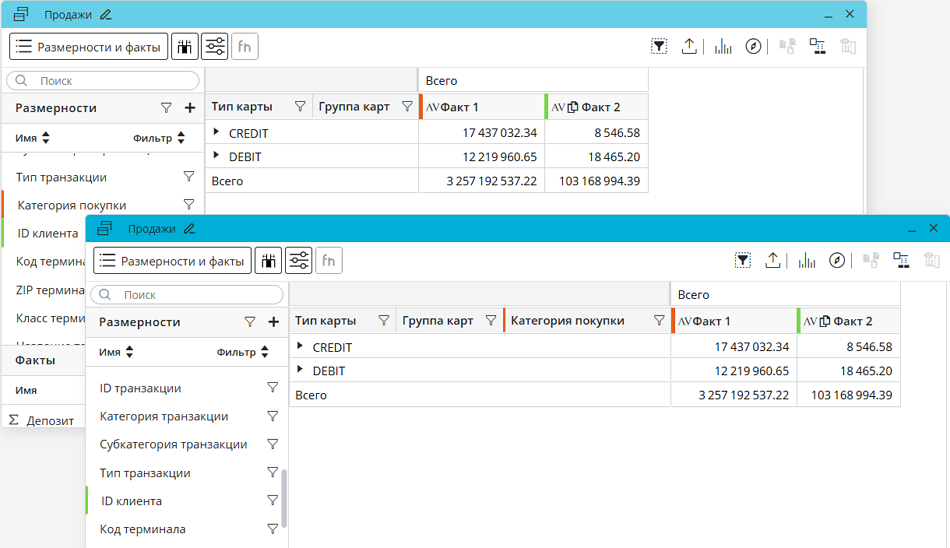 Два окна мультисферы на рисунке ниже имеют практически одинаковую конфигурацию, но в первом окне опорная размерность «Категория покупки» находится в области данных, а во втором — на панели размерностей и фактов. Сравним значения факта в этих окнах: