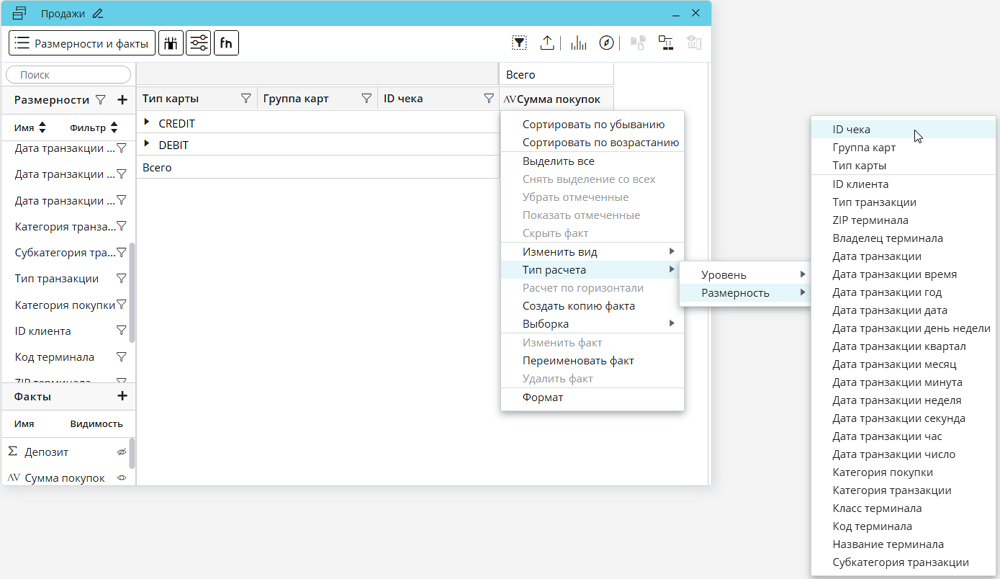 Допустим, нам требуется получить значения средней суммы чека отдельно для дебетовых и для кредитных карт, а также для каждой группы дебетовых и кредитных карт. Для этого нам нужно последовательно вынести влево размерности «Тип карты», «Группа карт» и «ID чека», показать факт «Сумма покупок», изменить его вид на «Среднее», а тип расчета на расчет по опорной размерности «ID чека». Чтобы выбрать опорную размерность для факта, нужно кликнуть на названии факта правой кнопкой мыши, в выпадающем списке навести курсор мыши на опцию «Тип расчета», затем на опцию «Размерность», а затем выбрать в списке нужную размерность: