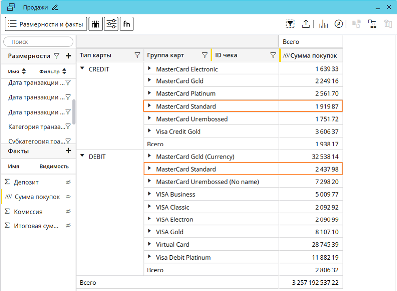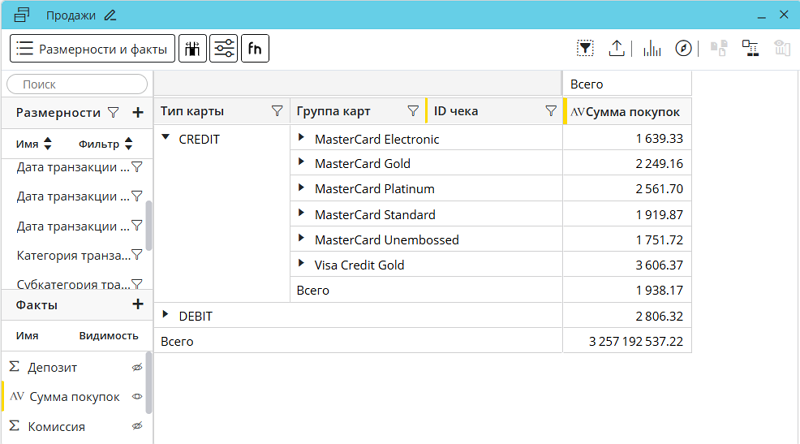 Если же вместо «Категории покупок» мы вынесем в рабочую область размерность «ID клиента», то порядок опорных размерностей изменится и значения для всех фактов пересчитаются. Первой вложенной размерностью для «Группы карт» станет размерность «ID клиента», и значения «Факта 3» для каждой группы кредитных карт будут отображать количество клиентов, оплативших покупки кредитными картами этой группы: