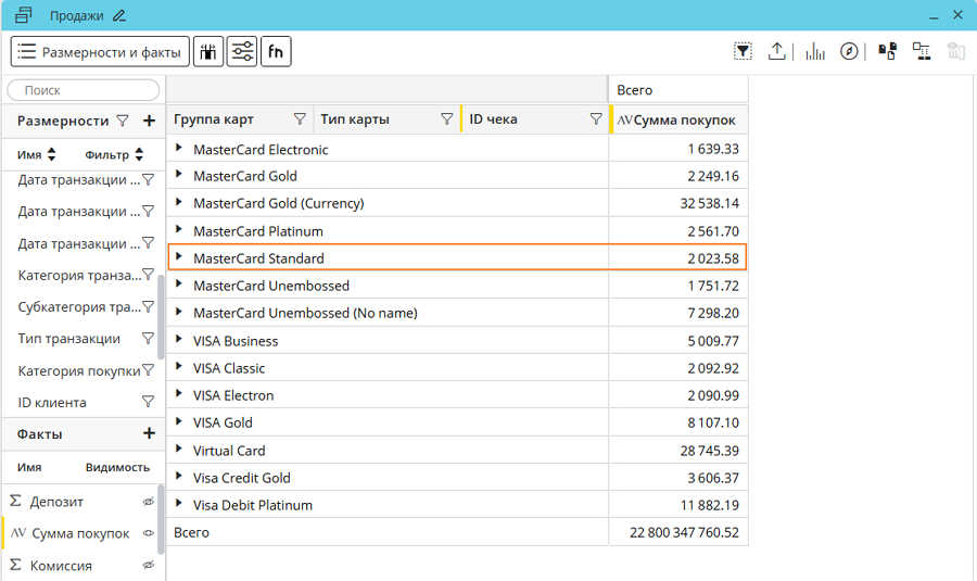 Таким образом, в примере выше покупки, оплаченные кредитными картами «MasterCard Standard», рассматривались отдельно от покупок, оплаченных дебетовыми картами «MasterCard Standard». Если же мы поменяем размерности «Тип карты» и «Группа карт» местами, элемент «MasterCard Standard» будет отображаться в единой строке, а значение средней суммы чека для этого элемента будет вычисляться с учетом и дебетовых, и кредитных карт вместе: