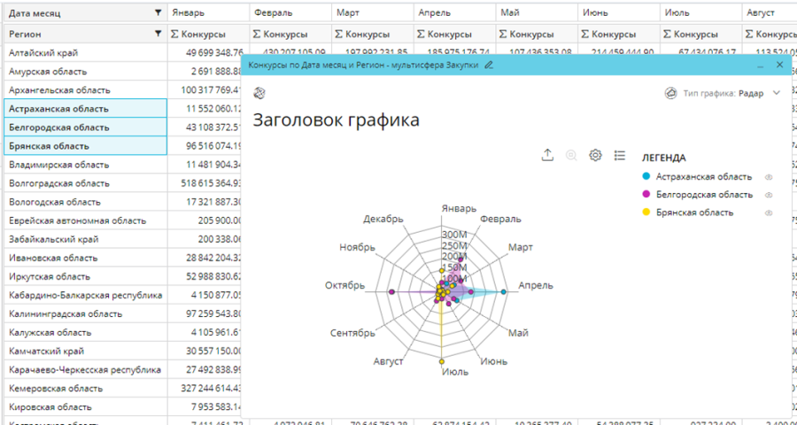 На графике Радар (или Лепестковая диаграмма) для каждого элемента левой размерности представлена ось, на которой в соответствии со значением фактов отображаются маркеры, на основе которых на графике отображаются области соответствующего цвета. Такой график идеально подходит для сравнения нескольких групп данных по нескольким категориям.
